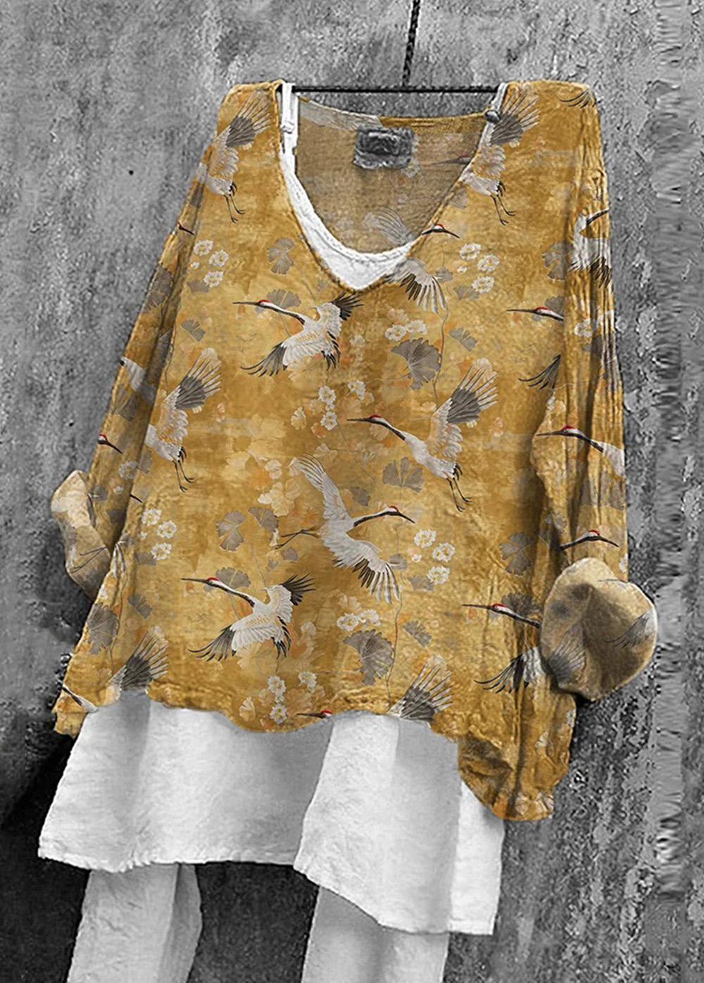 Japanese Art Crane Print V-Neck Casual Loose Linen Blend Blouse