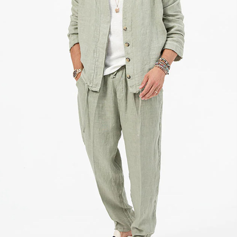 Wear the drawcord inside or outside to reduce bulk. The men's open-bottom linen-cotton pants with drawstrings for adjustability.