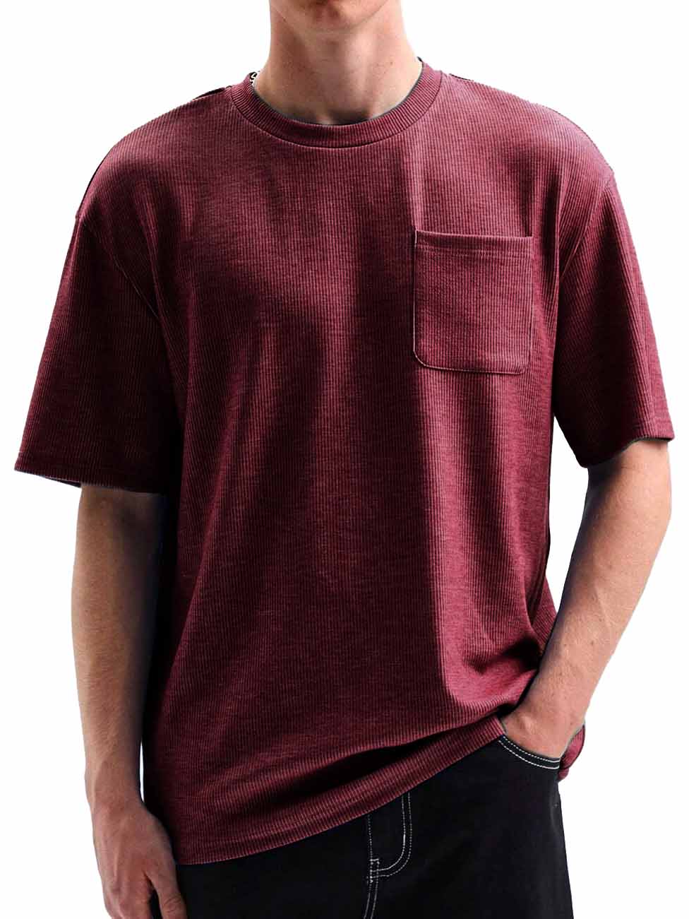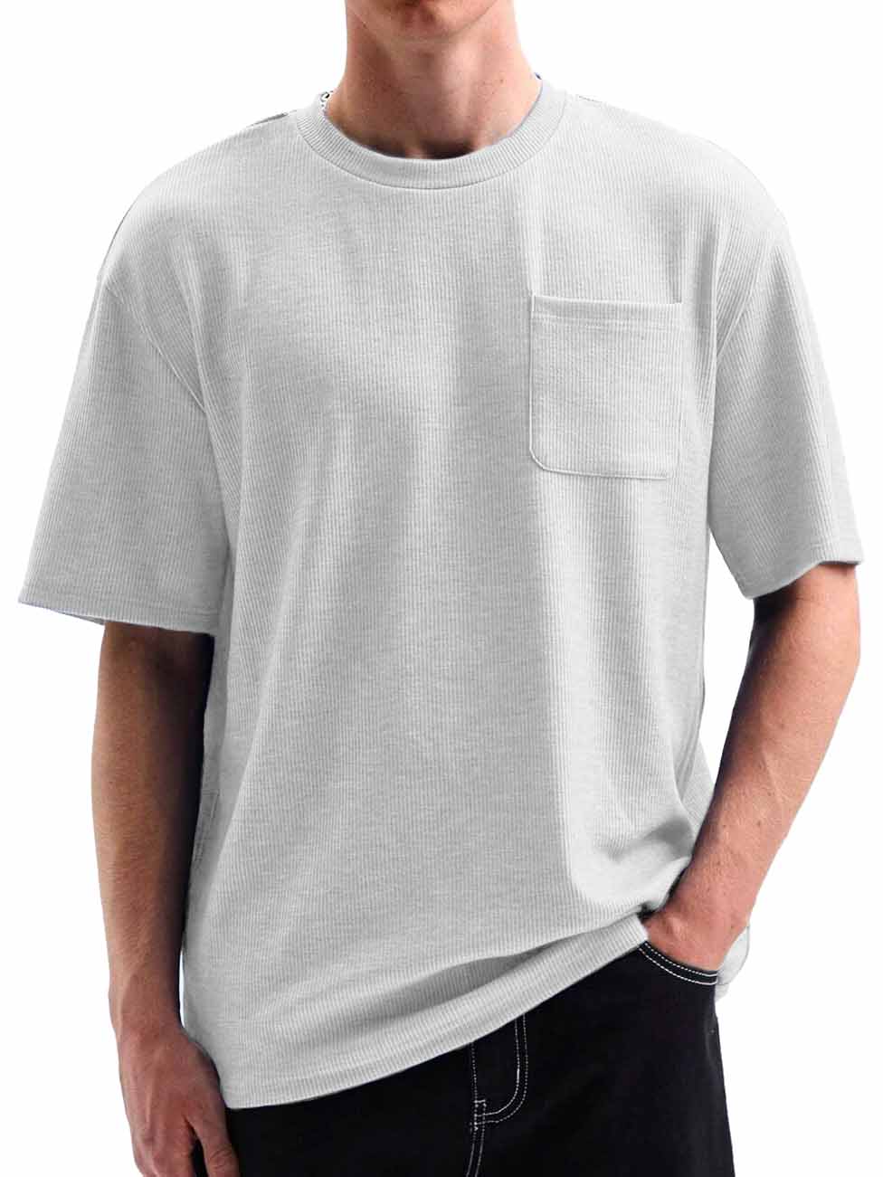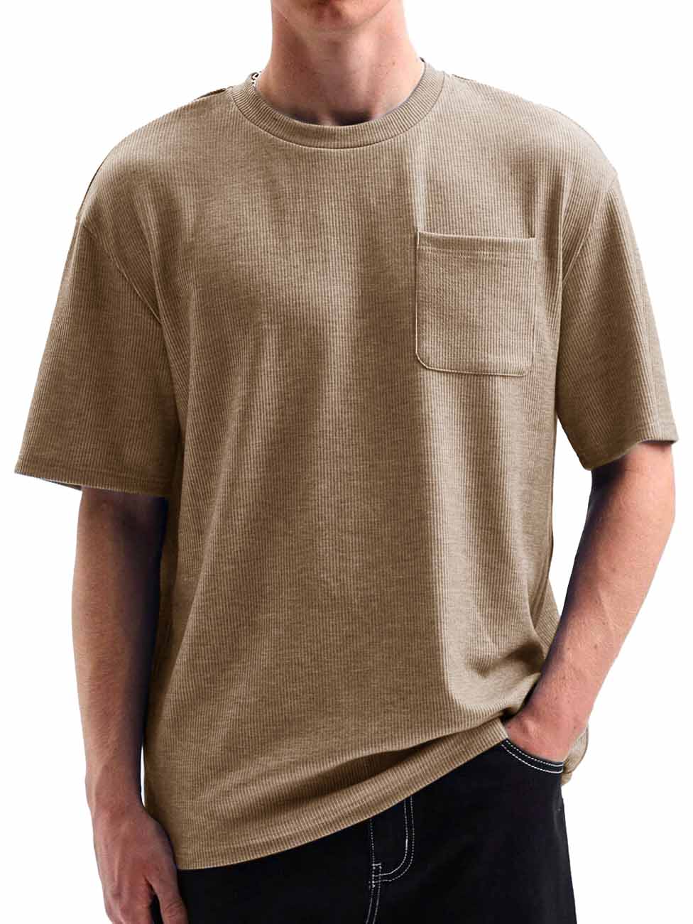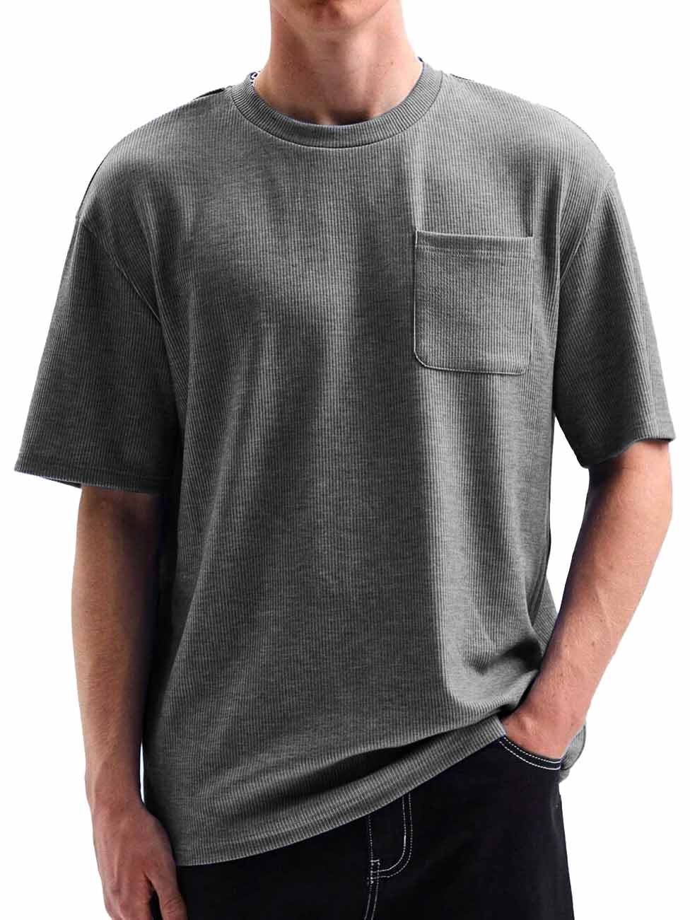 Men's Comfortable Basic Striped Fabric U-shaped Pocket Round Neck Short-Sleeved T-shirt