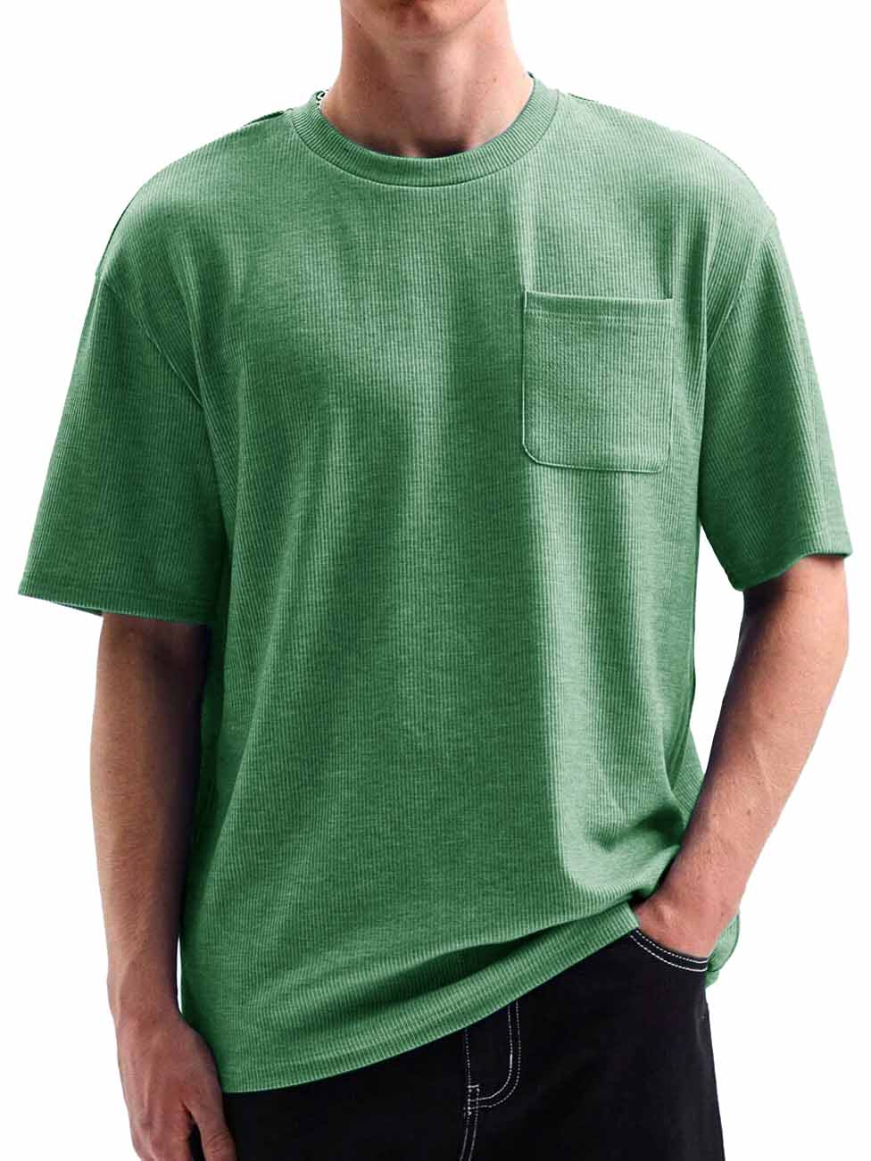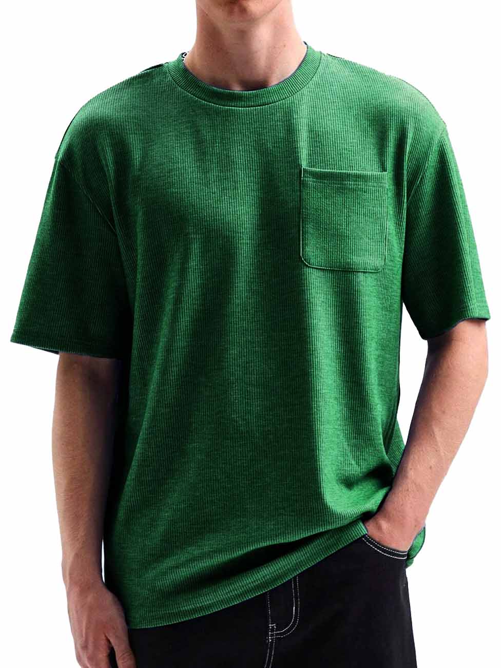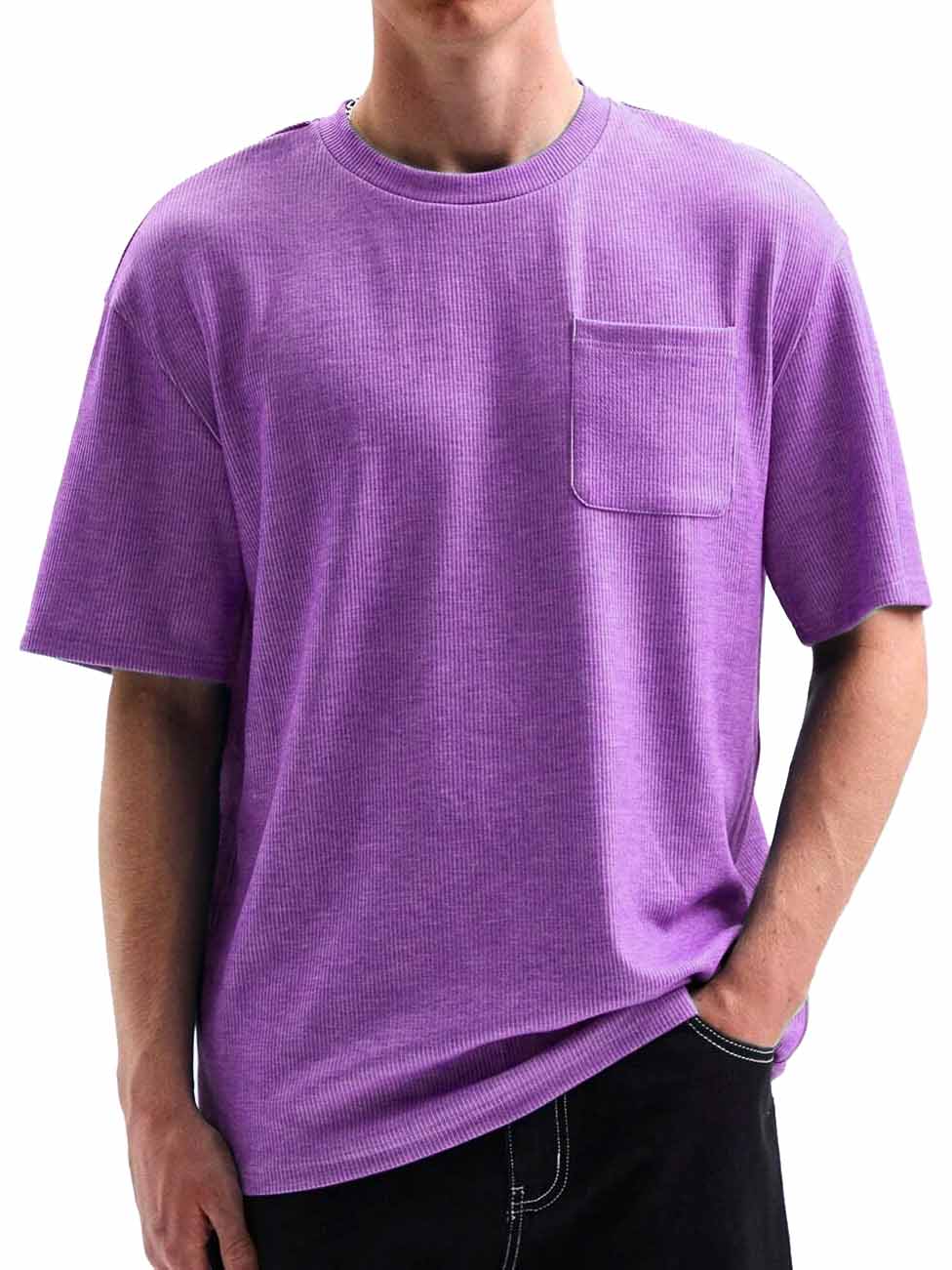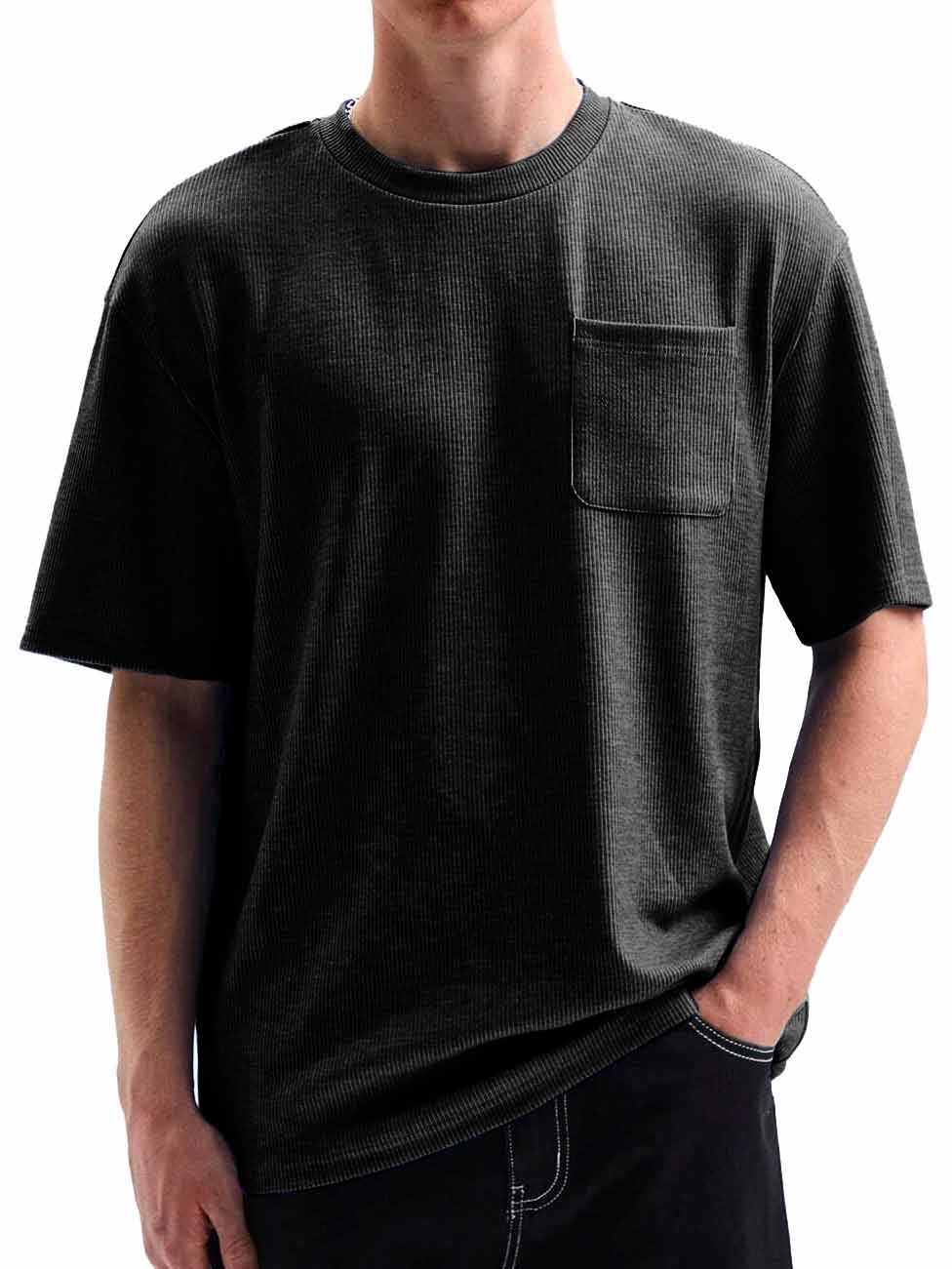 Men's Comfortable Basic Striped Fabric U-shaped Pocket Round Neck Short-Sleeved T-shirt