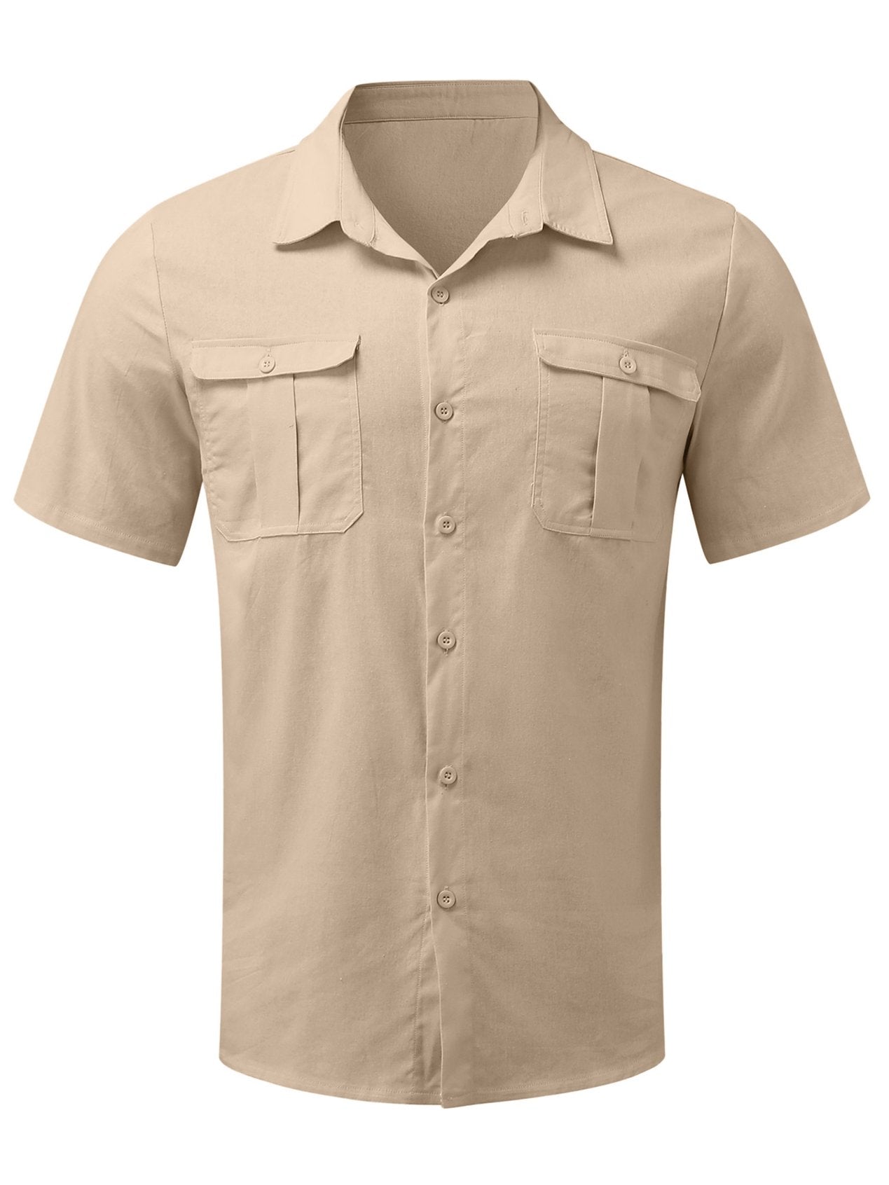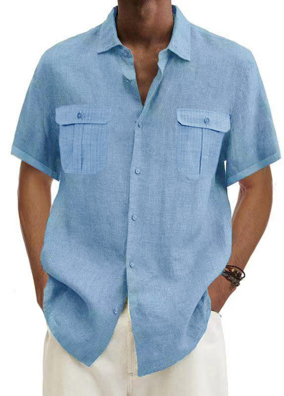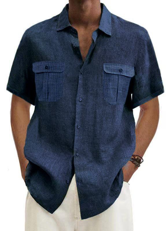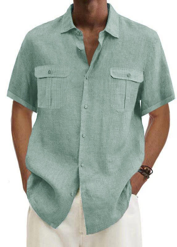 Men's Solid Color Double Pocket Cotton Linen Casual Short Sleeve Shirt