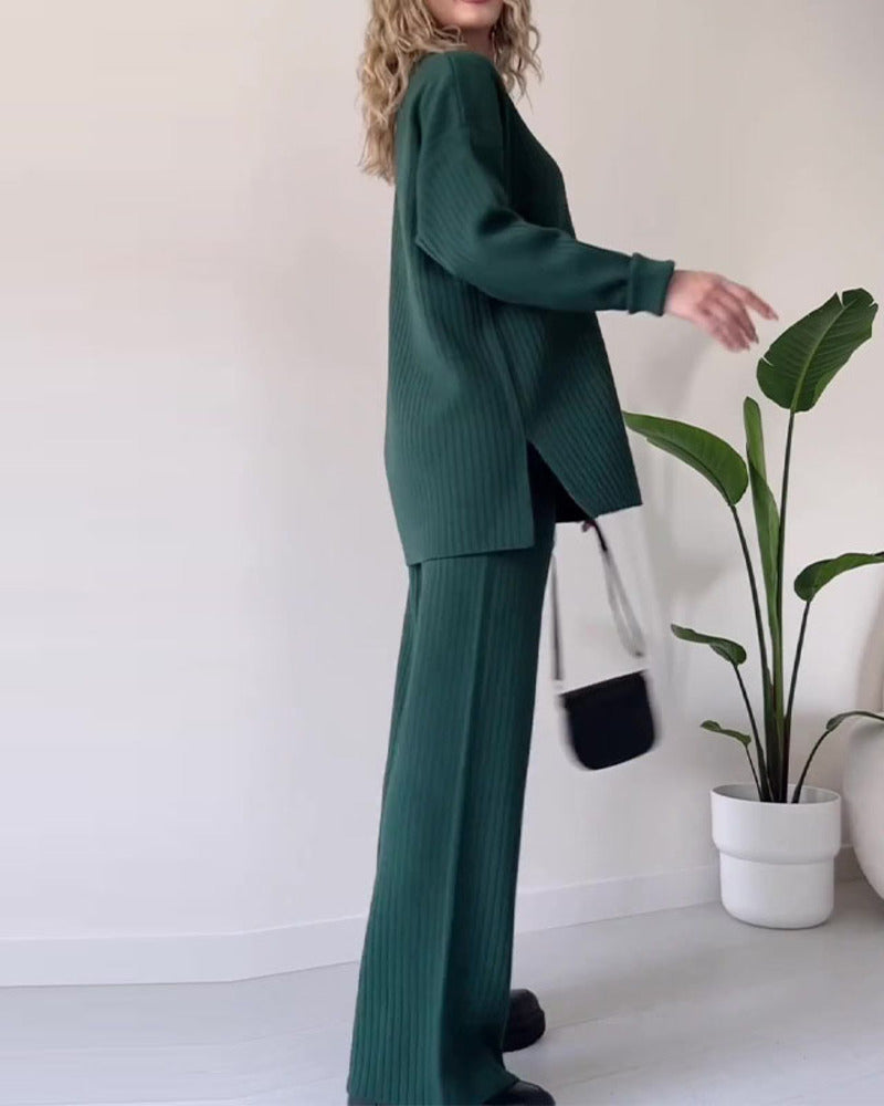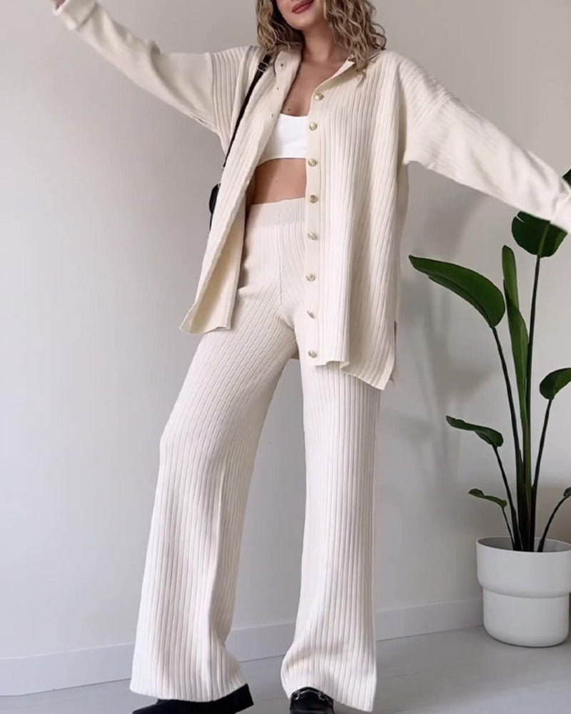 Solid Color Design Button Ribbed Knitted Two Piece Sets