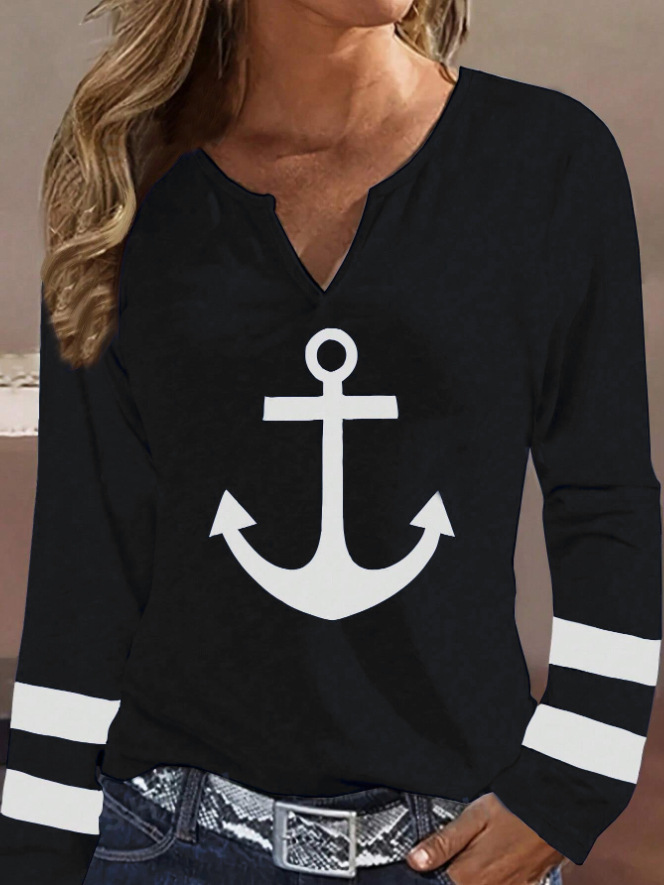 anchor print t shirt casual notched neck long sleeve top for spring fall womens clothing details 1