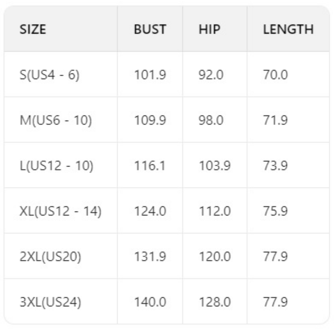 Size Guide(Unit: cm)
