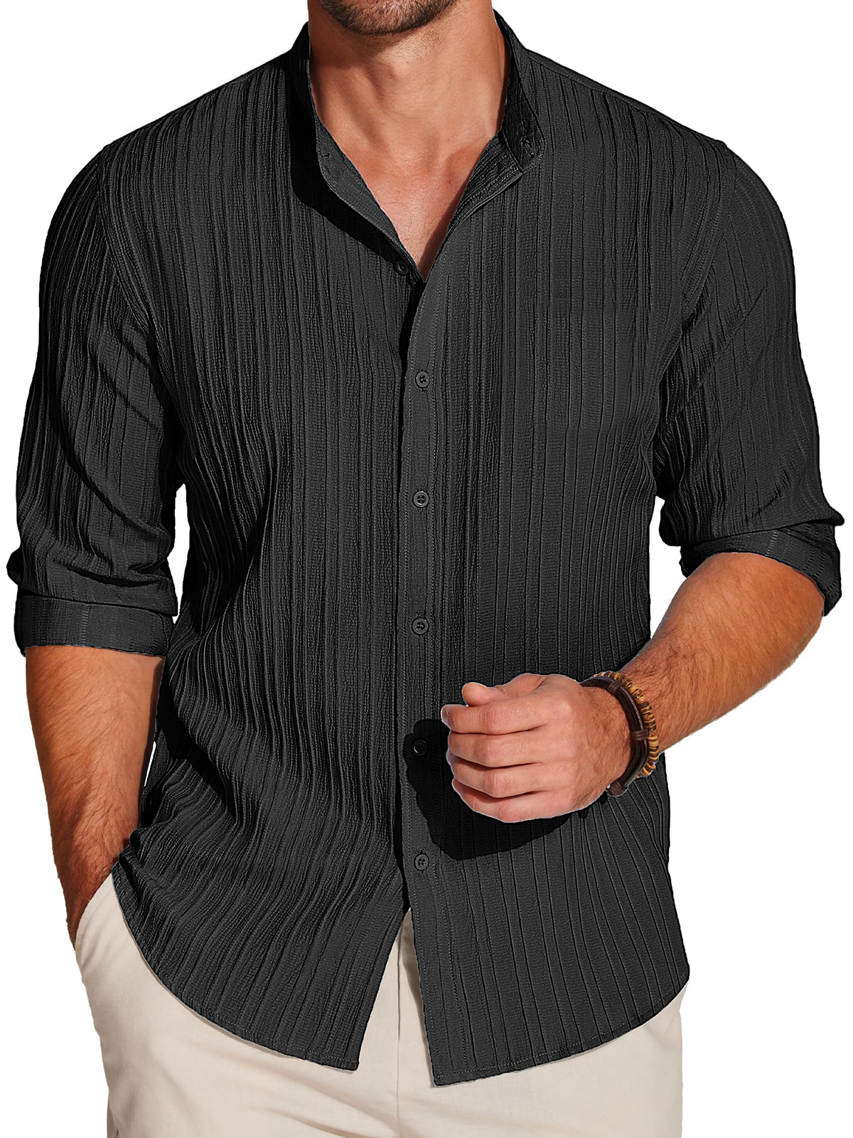 Men's Casual Shirt Linen Beach Long Sleeve Button Down Textured Shirts
