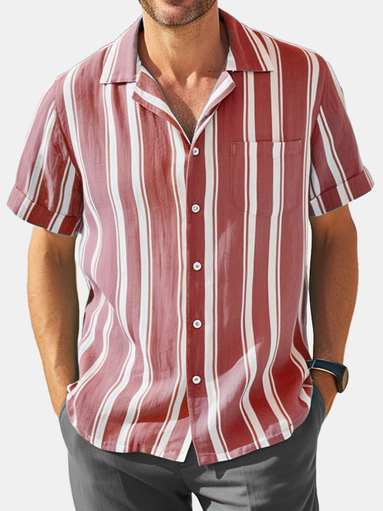 Men's Hawaiian Simple Striped Faux Linen Comfortable Short Sleeve Cuban Collar Shirt