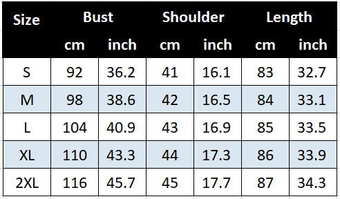 Note: The measurements are all dressed-on size. Please refer to the size details to choose your suitable size.