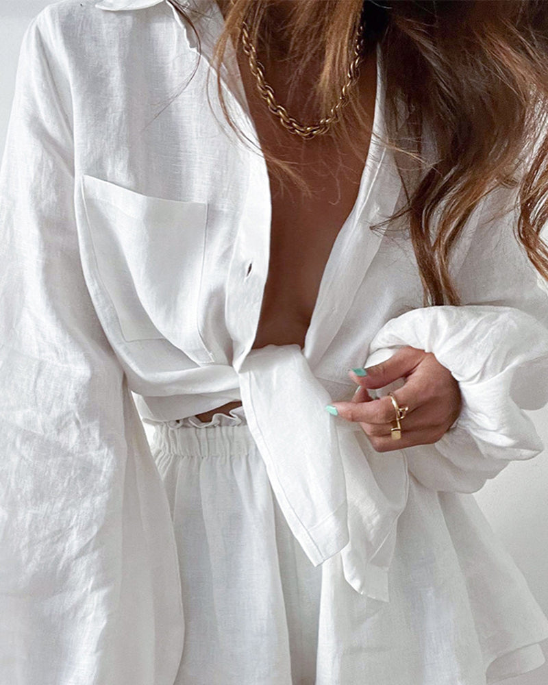 Ruffle Shorts Sets Two Pieces Lantern Sleeve Tops Elastic Waist Shorts Summer Suit Outfits