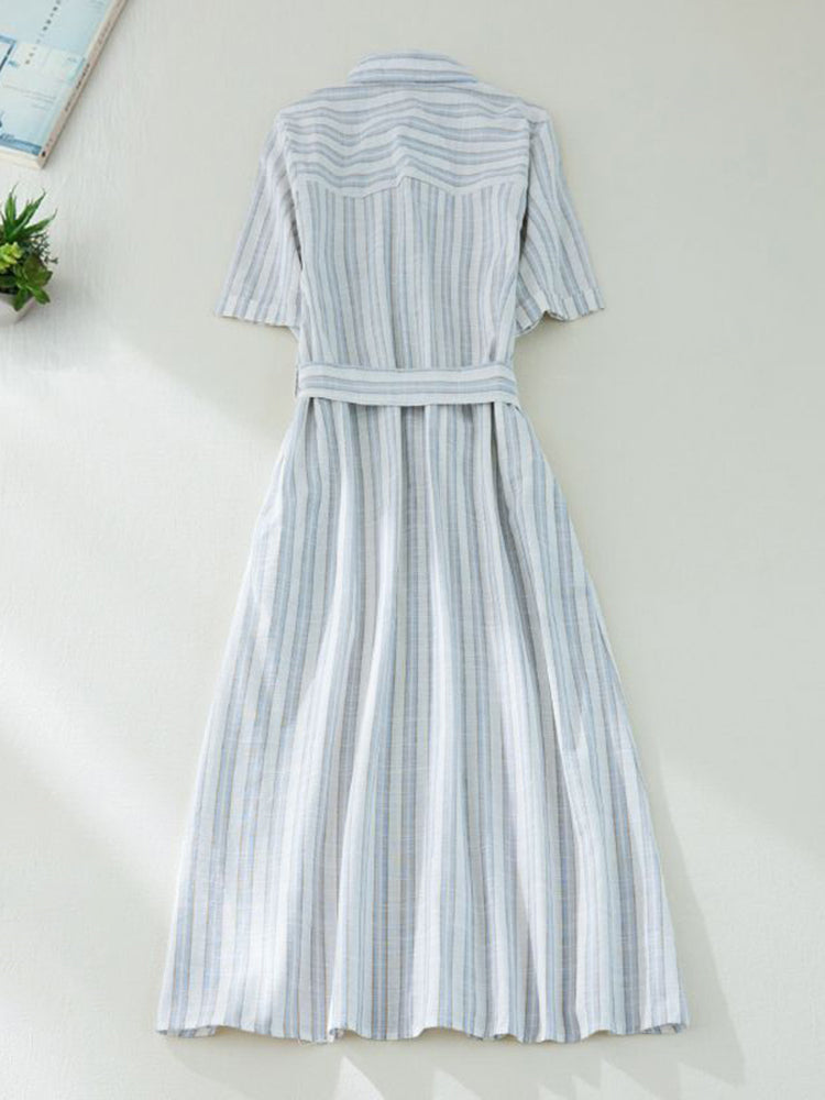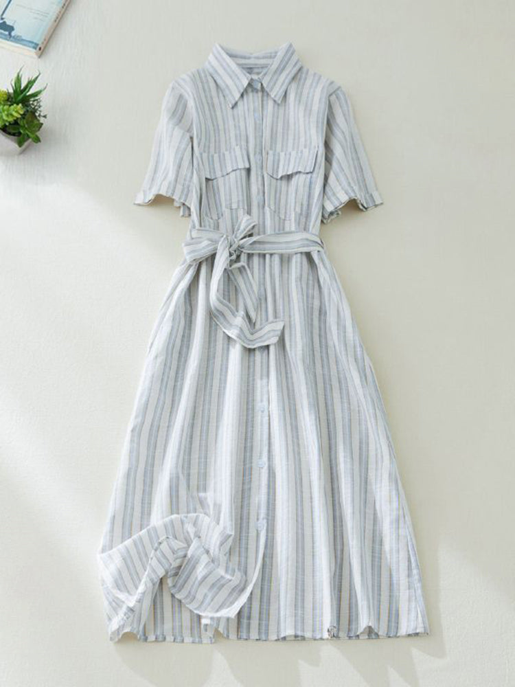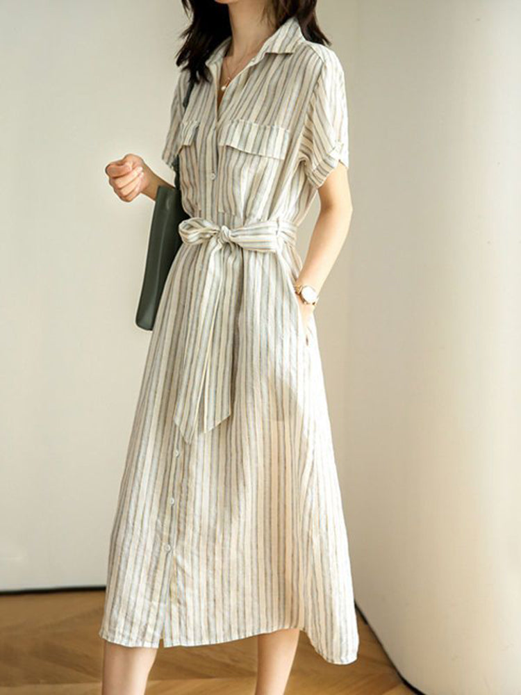 Short Sleeve Vertical Stripe Waist Shirt Dress with Belt