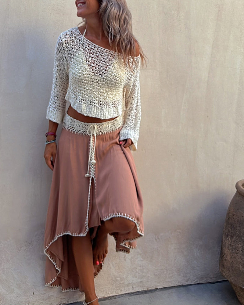 Stitching Hollow Women's Knitted Sweater Loose Round Neck Sunscreen Blouse