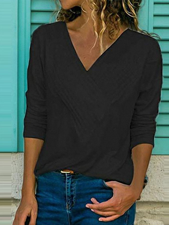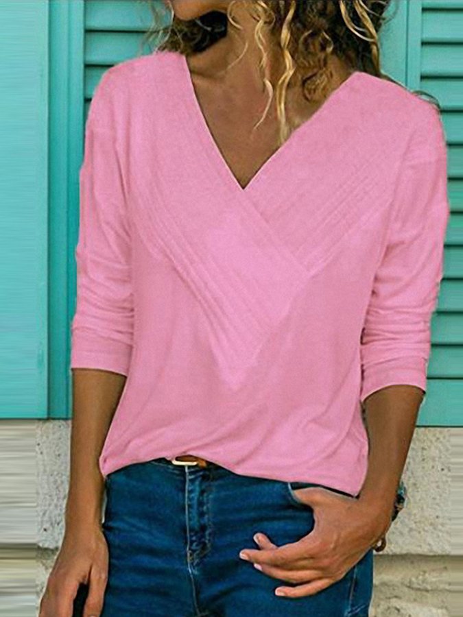 Women's Cotton Linen Big V Neck Hem Bifurcated Multi-layer Collar Pleated Long Sleeve T-Shirt Top